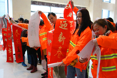 “春滿人間百花吐艷 福臨小院四季常安” “一帆風(fēng)順年年好 萬事如意步步高” ……1月26日至28日,麗匯大廈一樓熱鬧非凡,為了感激社會(huì)各界對(duì)綠港集團(tuán)的關(guān)心與支持,由綠港集團(tuán)工會(huì)組織的書法家“迎新春 送祝福”義務(wù)送春聯(lián)活動(dòng)吸引了大量前來求墨寶的社會(huì)各界人士。三位南寧市書法協(xié)會(huì)的書法家以及南寧科巨公司副總經(jīng)理陸章發(fā)為觀眾們現(xiàn)場揮毫,一幅幅金燙燙、散發(fā)著墨香的春聯(lián)映襯著人們的笑臉,整個(gè)現(xiàn)場彌漫著濃濃的年味,短短三天時(shí)間便送出了2000多副春聯(lián)。1月26日上午,綠港集團(tuán)工會(huì)還啟動(dòng)了派送春聯(lián)儀式,綠港集團(tuán)工會(huì)主席黃麗琴帶領(lǐng)工會(huì)人員將春聯(lián)送到經(jīng)開區(qū)40余位保潔人員、園林綠化工人、公司職工的手上。(張彩秀/文、圖)