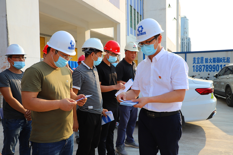 綠港集團黨委書記、董事長龔國強給項目一線人員發(fā)放《工程建設廉政手冊》(張彩秀 攝)